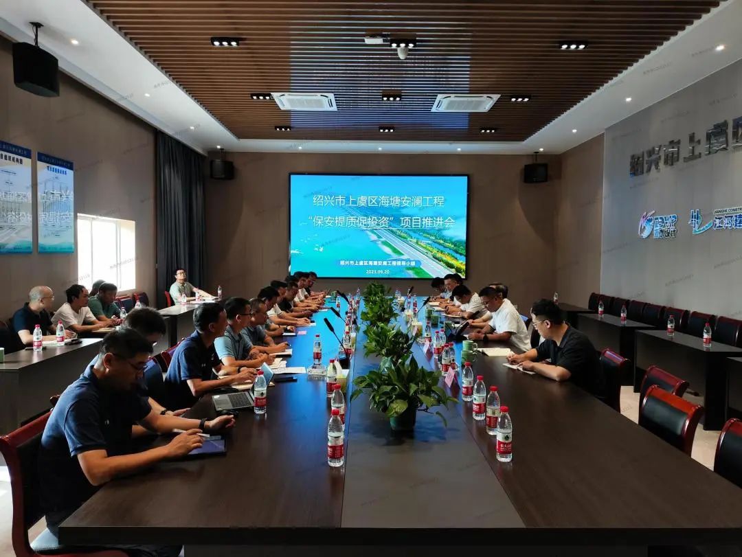 9月20日上午,上虞區海塘安瀾工程項目部召開上虞海塘安瀾工程“保安提質促投資”項目推進會,上虞區副區長黃俊毅、上虞水投集團董事長陳海華等出席,公司董事長袁偉忠代表施工單位發言。