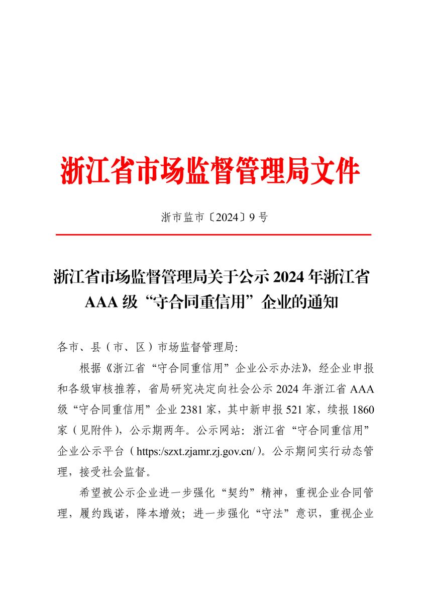 近日,浙江省市場監督管理局公布了2024年浙江省AAA級“守合同重信用”企業名單,浙江江河建設有限公司繼續榮獲該稱號。